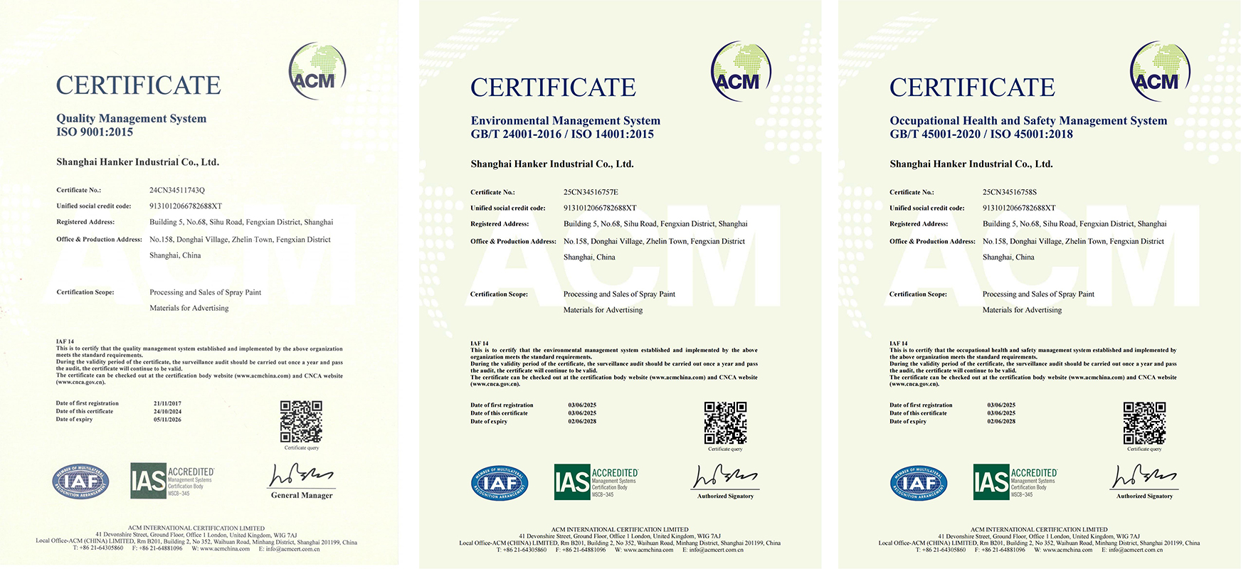 Kürzlich erhielt Shanghai Hanker Industrial Co., Ltd. (als "Hanker" bezeichnet) die Zertifizierung von ISO 9001: 2015 Quality Management System, ISO 14001 -Zertifizierung des Umweltmanagementsystems und ISO 45001 Arbeits- und Sicherheitsmanagementsystem -Zertifizierung durch das Audit von ACM International Certification Limited. Diese Leistung zeigt, dass das Unternehmen internationale Standards in Bezug auf Qualitätskontrolle, Umweltschutz und Sicherheit der Mitarbeiter vollständig erfüllt hat. Der Erwerb dieser drei Systemzertifizierungen ist das Ergebnis der langfristigen Verpflichtung von Hanker für das standardisierte Management. Durch die Optimierung von Produktionsprozessen, die Festlegung von Mechanismen für Umweltrisiken und -kontrollverhütung und Verbesserung der Gesundheits- und Sicherheitstrainingsysteme hat das Unternehmen eine standardisierte Kontrolle über die gesamte Kette von der Rohstoffbeschaffung bis zur Lieferung der Fertigprodukte erhalten. In Zukunft wird Hanker diese Zertifizierungen als Stiftung annehmen und die technologische Innovations- und Management-Verbesserung weiter vertiefen, die Zusammenarbeit mit der Branche-Universität mit Universitäten aktiv fördern, die modernsten Anwendungen im Materialbereich erforschen und zur qualitativ hochwertigen Entwicklung der Branche beitragen.